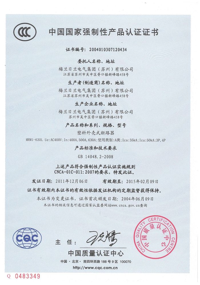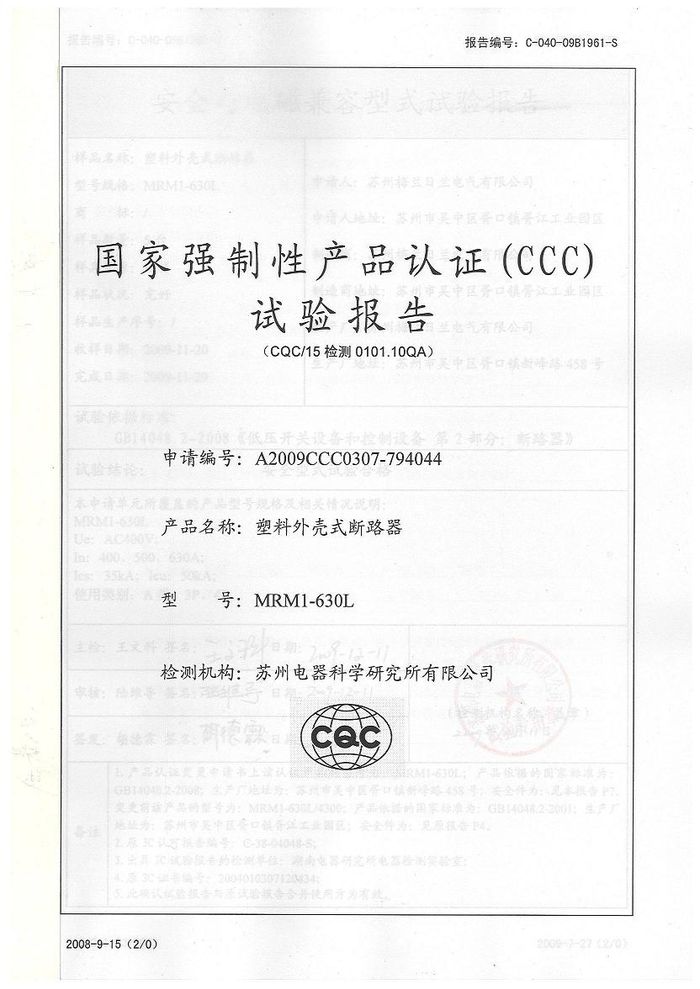 MRM1-630L塑殼短路器資質證書