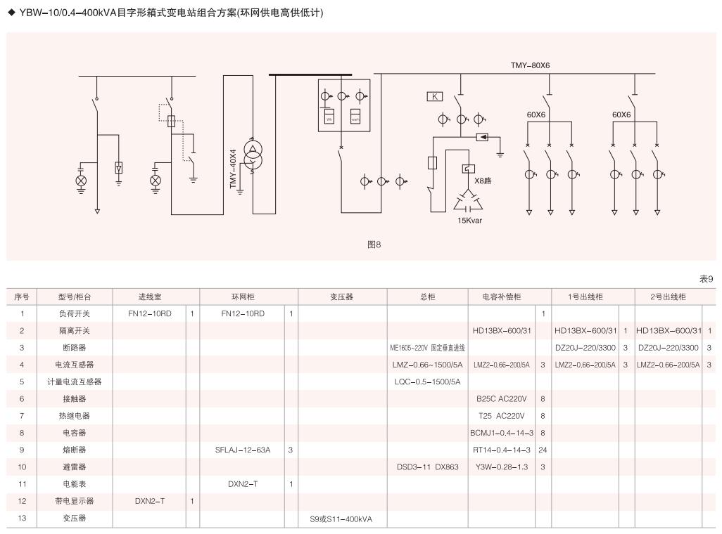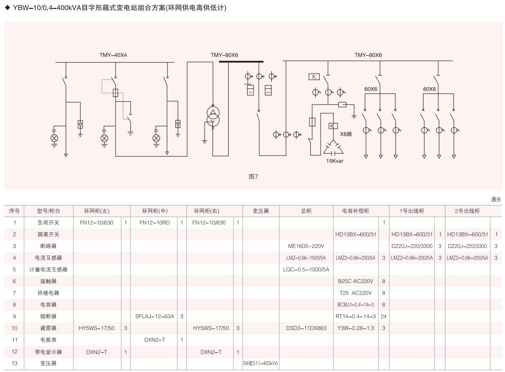 本變電箱高、低壓?jiǎn)卧捎媒M合式柜.按所需要接線(xiàn)組合成高、低壓配電系統(tǒng)常用高、低壓柜的接線(xiàn)方案均可選用,同時(shí)高壓?jiǎn)卧挚山M合成環(huán)網(wǎng)型式等。(見(jiàn)表4、表5)
