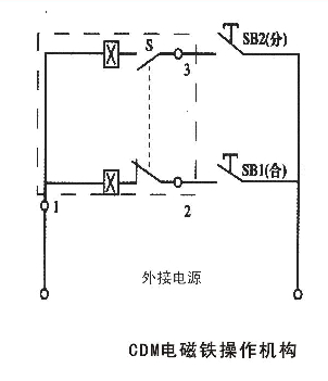 CDM電磁鐵操作機(jī)構(gòu)(配用MRMl-63,100,225)接線圖見下圖(虛框內(nèi)為斷路器外符號(hào)說(shuō)明:SBi、SB2操作按鈕(用戶自備)
