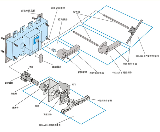 手柄可直接裝在開關(guān)上操作(簡(jiǎn)稱柜內(nèi)操作),也可通過加長(zhǎng)軸在配電柜門外操作(簡(jiǎn)稱柜外操作),提供操作方便。