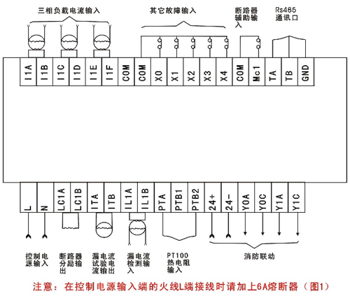 | ILIA. ILIB | 漏電輸入端,接零序互感器的輸出端。 RS485通訊口,TA、TB為485信號(hào)線,GND為信號(hào)地 |
