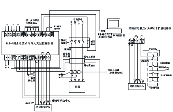 3、分體式剩余電流監(jiān)控探險(xiǎn)測器端子圖和外接線路圖