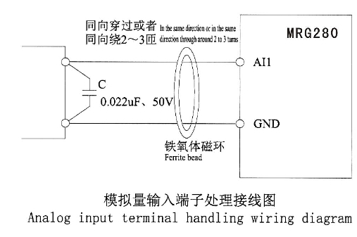 在某些模擬信號受到嚴重干擾的場合,模擬信號源側(cè)需加濾波電器或鐵氧體磁芯,如下圖