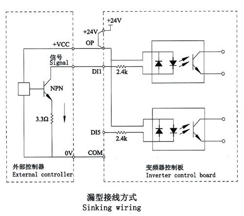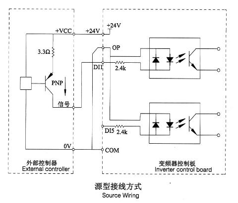 這是一種最常用的接線方式。如果使用外部電源,必須把+24V與OP間的短接片去掉,把外部電源的24V正極接在OP端子,外部電源OV經(jīng)控制器控制觸點后接到相應的Dl端子。