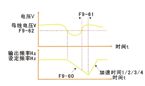 此功能指在瞬時停電時變頻器不會停機,在瞬間停電或電壓突然降低的情況下,變頻器降低輸出速度,通過負(fù)載回饋能量,補償電壓的降低,以維持變頻器短時間內(nèi)繼續(xù)運行。