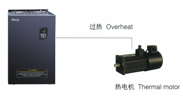 選用輸入輸出擴展卡,模擬量輸入A13可接受電機溫度傳感器輸入(PTlOO,PTlOOO)。當(dāng)電機溫度越過預(yù)警值時,變頻器輸出脈沖信號提示過熱,當(dāng)電機溫度超過過熱保護值時,變頻器故障輸出給電機妥善的保護。