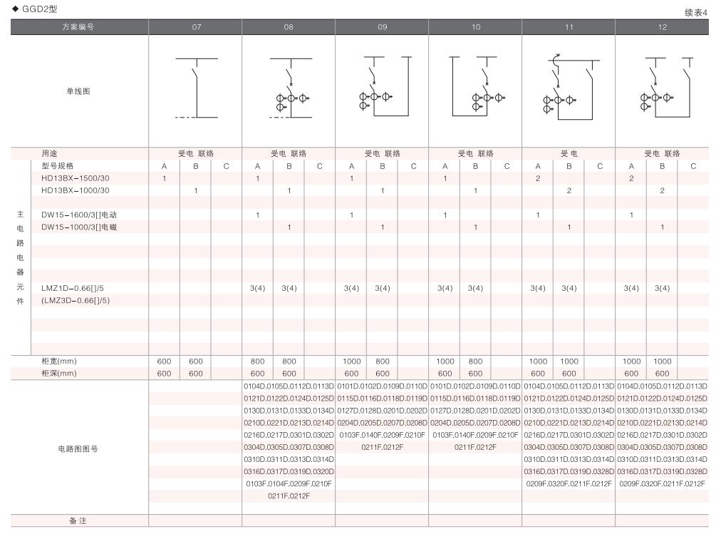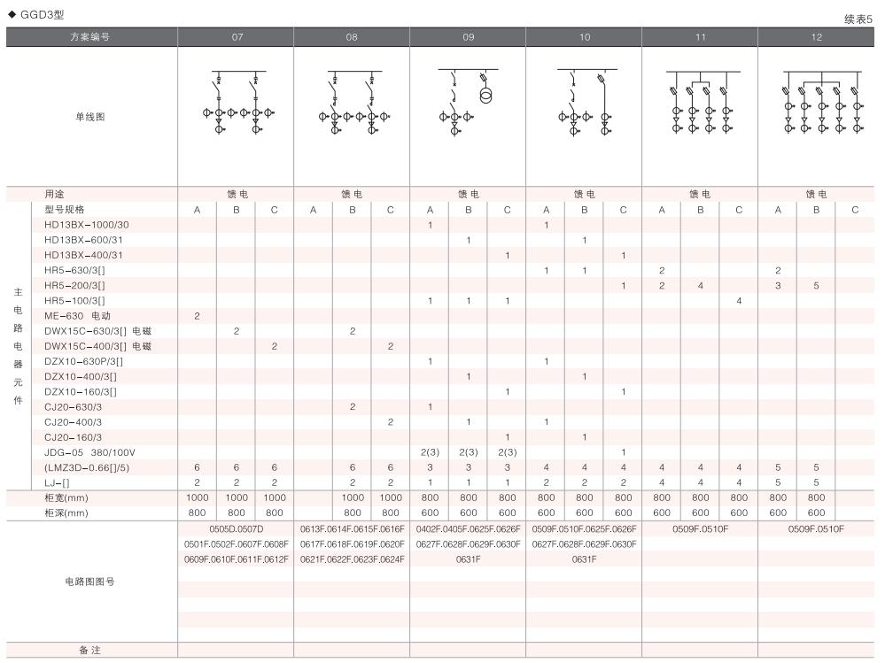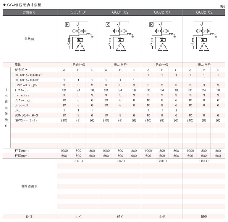 此外,為適應(yīng)無功補(bǔ)償?shù)男枰O(shè)計(jì)了GGD電容補(bǔ)償柜,其主電路方案4個(gè),共12個(gè)規(guī)格。